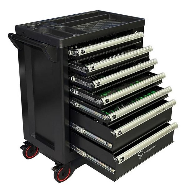 - Kit completo de ferramentas: soquetes, extensões, bits, chaves combinadas, alicates, martelos, torquímetros e muito mais — tudo armazenado no próprio carro para máxima praticidade.